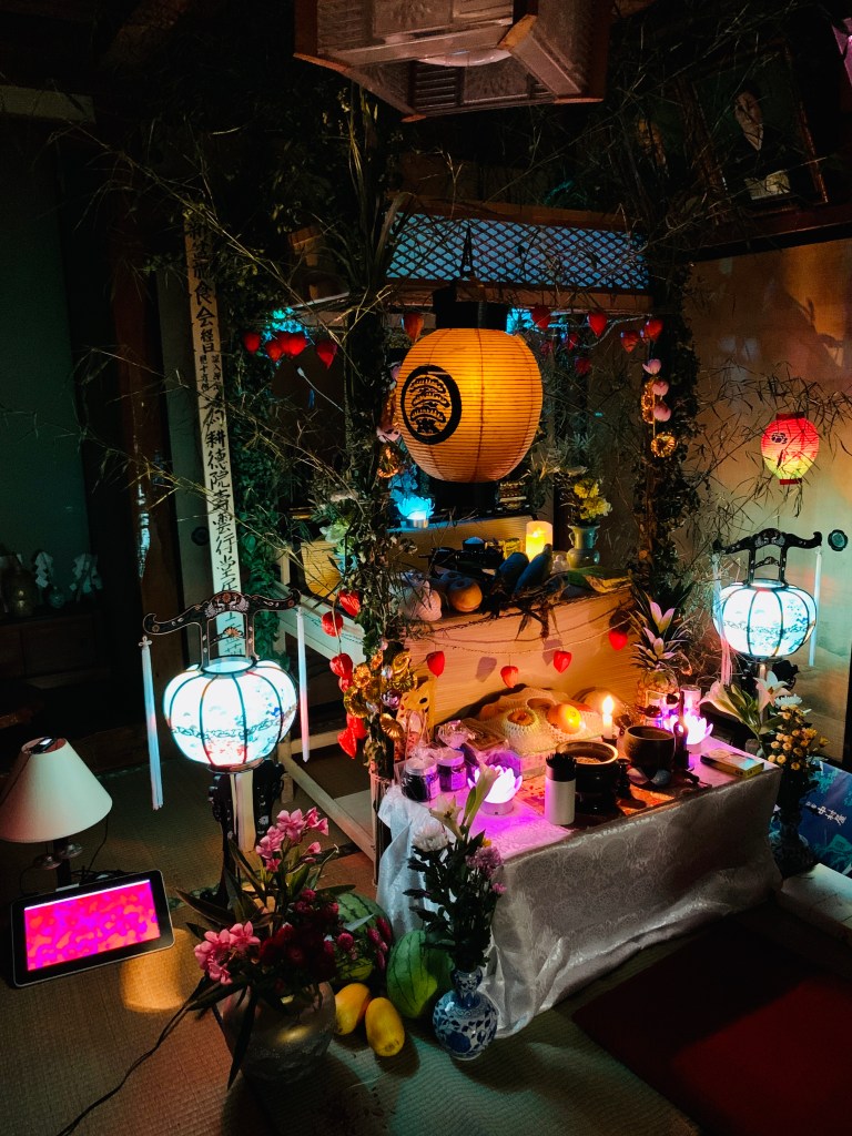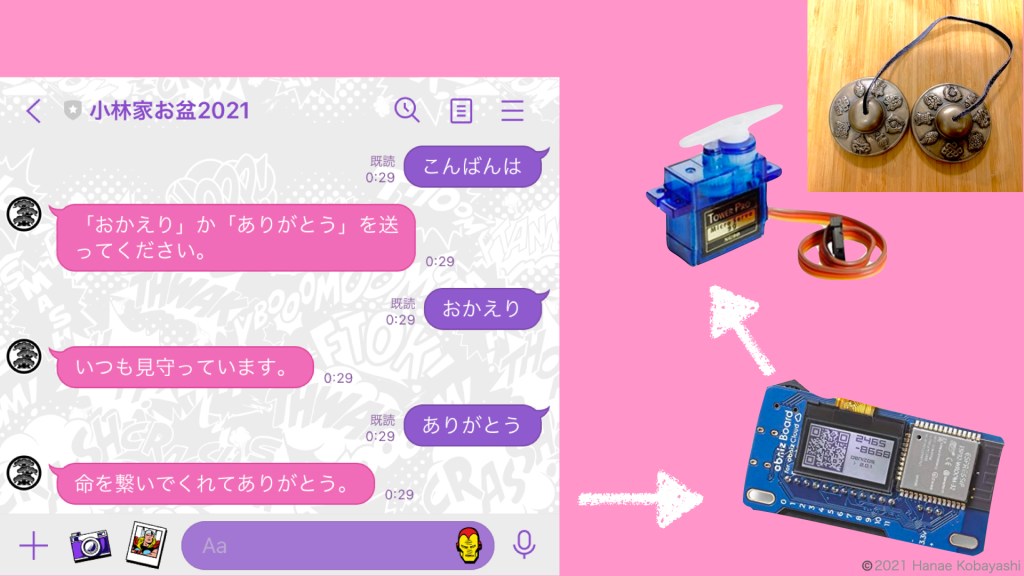 ご先祖さまLINEbotにメッセージを送ると、盆棚のベルが遠隔でチリーンと鳴り、リアルタイム生成される映像の色が変化します。